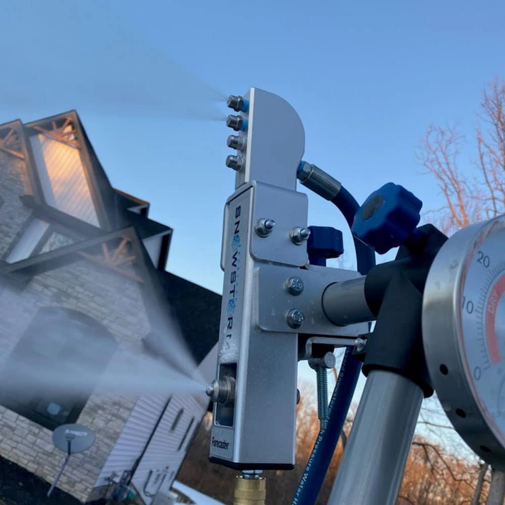 The Backyard Snowstorm Snow Gun uses high pressure to breakdown the main water stream into desired water droplet sizes and propel them away from the gun and it uses an internal mix nucleator nozzle to provide nucleation sites. Our Snow Gun is not an Internal Mix Snow Gun, we use an Internal Mix nucleator.
